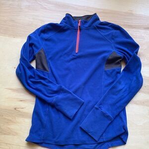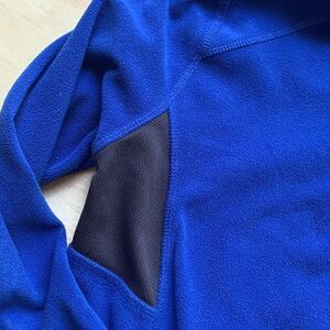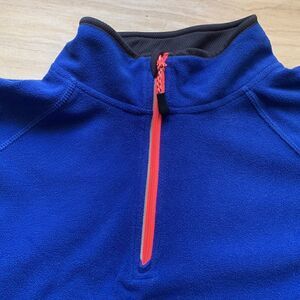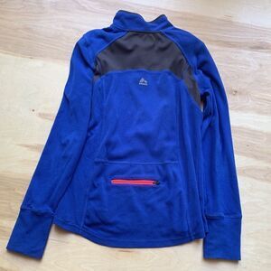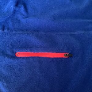 RBX fleece pullover is royal blue with black panel inserts. Neon orange zipper with a neon orange back pocket. Reflective lettering. Cut out at end of sleeve.