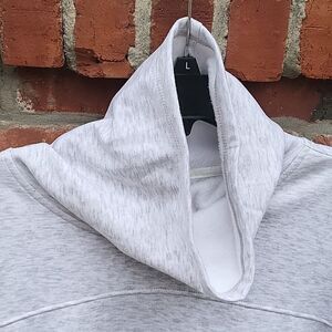 pocketed light Grey, cinched back pull over. cowl neck. chest 22" and 27" length