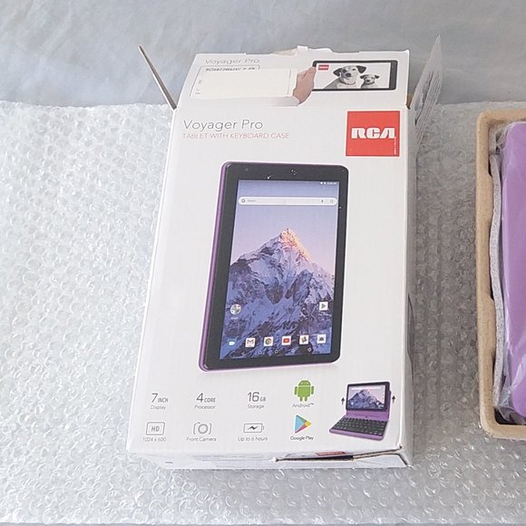 Open Box. Please see pictures. RCA Voyager Pro Tablet W/ Keyboard Case, 7" Multi-Touch Display - Purple.