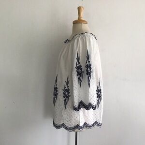 RD KOKO White Eyelet and Blue Embroidered 3/4 Sleeve boho elastic neck blouse M