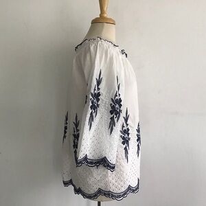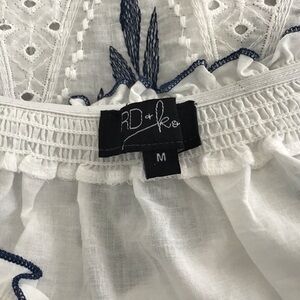 RD KOKO White Eyelet and Blue Embroidered 3/4 Sleeve boho elastic neckline blouse M