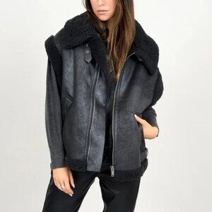 • This sherpa lined biker vest has sherpa spread collar, exaggerated shoulders and side pockets