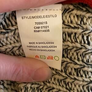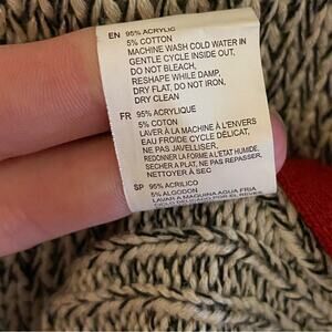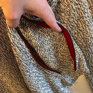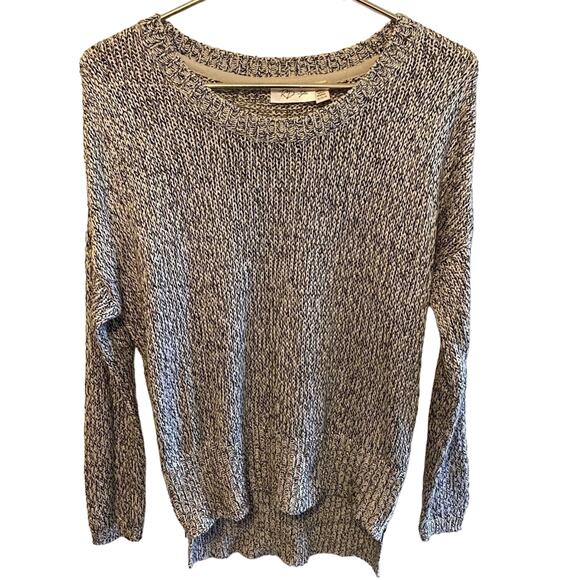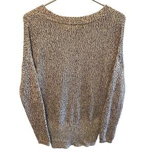 Excellent pre-owned condition. Grey/cream round neck long sleeve tight knit oversized pullover sweater. Has zippered slit up each side, can be unzipped or zipped. Hangs longer in back (see measurements). Acrylic/cotton material. Approx. Measurements: Shoulder to front hem 26”, Shoulder to back hem 31”, Pit to pit 27”, Sleeve from neck to sleeve hem 31”. Size M.