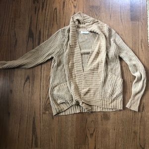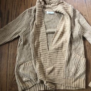 Open style cardigan in tan. Shawl collar style with no closure. Medium weight. Great layer for the winter. Smoke and pet free house.