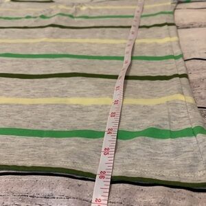 RD Style Grey/Oatmeal tee with green and yellow stripes. Scoop neck. Short sleeves. Tulip hem on back. Top can be worn open in back, or with button fastened for a slightly more modest look. New with tags. Size small.