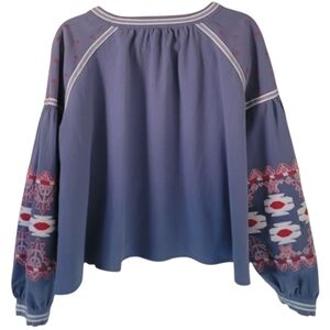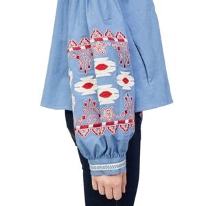 This vintage-inspired jacket features a heavyweight 100% cotton fabrication and beautifully stitched tribal embroidery. Wide embroidered ballon sleeves and a swingy silhouette. It is cropped with two front ties and hip pockets.