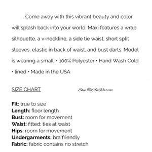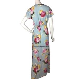 Red Dress Boutique floral rayon baby blue maxi dress with pretty floral print and adjustable wrap style so there is flexibility on bust/waist measurements based on how you adjust wrap. Partially lined, split flutter sleeve. Poly/poly lined. Approx 59” long. Size small, tts. Same front also available in a mini dress. Price is FIRM please.