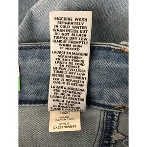 68% cotton, 26% polyester, 4% viscose, 2% spandex, machine wash, two front faux pockets, two back pockets, mild distressing around front pockets, light wash