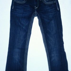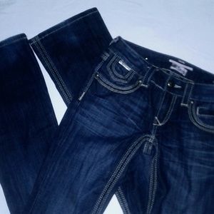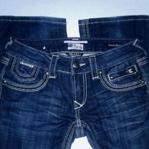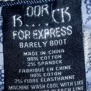 NWOT: RE ROCK FOR EXPRESS brand styled in Los Angeles. Size 00R. Barely boot style. Inseam length 32in, 6 in rise, across front waist is 14 in. Very nice & very well made pair of jeans!!! NWOT