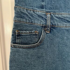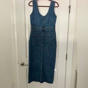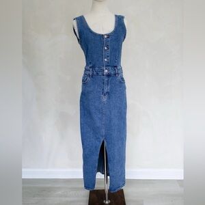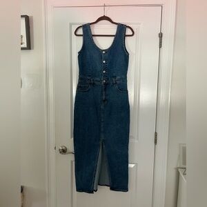Chic denim overall dress with button-up front. Sleeveless design. Perfect for casual wear.
