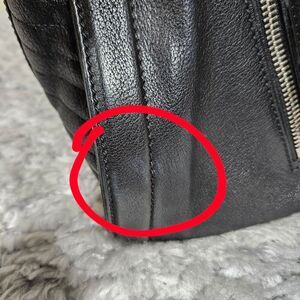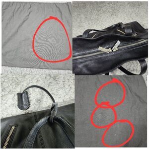 It has corner and edge wear as shown in photos, wear on the strap and where the straps attach to the bag as shown in photo, and a couple marks on the front as shown in photos. There is residue/fading on the inside as shown in photo. Measurements are shown in photos. Bag includes lock and keys.