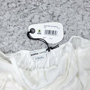 Women's Prana Fernie Wide Leg Jumpsuit in white tencel or modal. New with tags, but has a small stain/mark on the neckline as shown in photo. Style number 2066751. Women's size small, real measurements shown in photos with jumpsuit laid flat:
