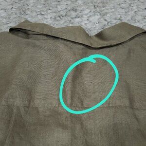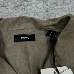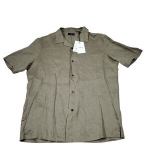 Men's Theory Daze Precise Linen short sleeve button down collared shirt or top in gray-green "Wasabi". New with tags, but has multiple pulls/excess fabric spots on the back and front as shown in photos. Men's size large, real measurements shown in photos with shirt laid flat: