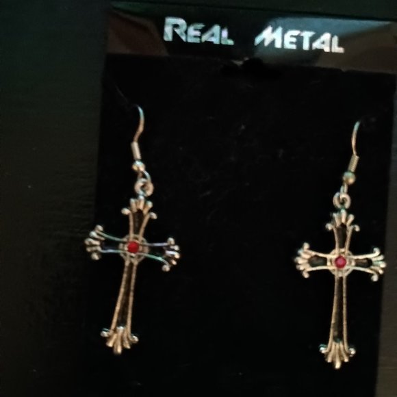 REAL METAL GOTHIC VICTORIAN CROSS W/ RED AUSTRIAN EARRINGS