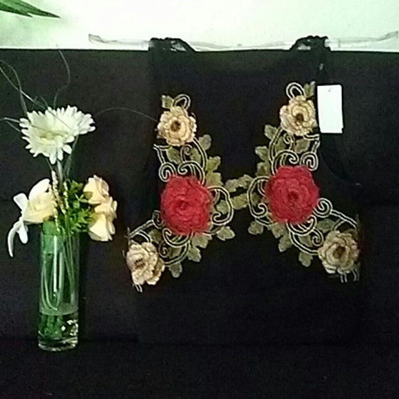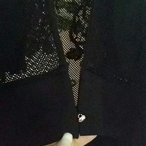 Black with cut sleeves crosses in back and has two buttons in back at bottom. Never worn just got it and just realized one button is missing. Price will reflect.