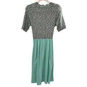 This midi dress features a striking leopard print bodice with a solid mint green skirt. The waist tie accentuates the figure, while short sleeves provide a comfortable fit. Its polyester-spandex blend ensures a soft, stretchy feel. An ideal choice when you want to make a stylish statement.
