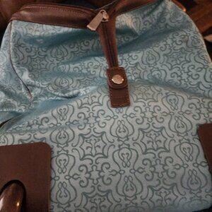 REBA Western design. Turquoise with brown trim on wheels. 19"w x 14"h x 12"d