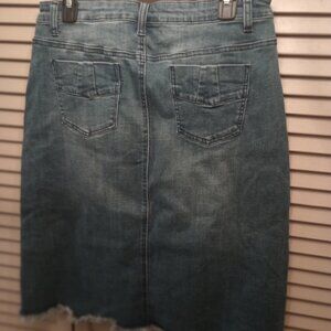 Reba denim skirt with fringe hem. 73% cotton , 14% rayon, 11% polyester, 2% spandex. Gently used from smoke free home.