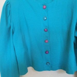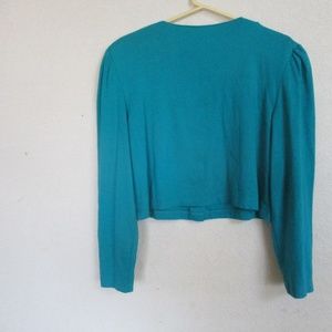 Nice evening crop jacked by REBE. Attractive button coloring. Size 16 -- 50% Polyester 50% Cotton. Can be used as a crop top or light over jacket. Machine washable. Great for summer evenings.