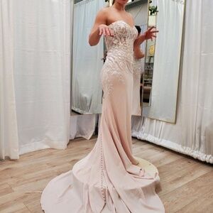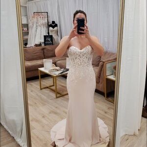 Hi ladies, I have this NWT Maggie Sottero/Rebecca Ingram dress for $500 or best offer! This is the Lily style (discontinued). Bridal size 14. Would likely for a size 8/10- or could be altered for a 4/6 (im a 4/6 and we were going to alter.) She’s a sweetheart neckline, illusion corset bodice (stunning) with sequins, ivory top over blush bottom, fit and flare bottom with buttons down the entire train. I really fell in love with how unique this dress is. This dress is in perfect condition, I just found a totally different look for my wedding!