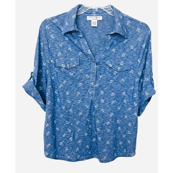 REBECCA MALONE SHORT SLV POINTED COLLAR V-NECK TOP, WOMENS, 1X, BLUE, ANCHORS