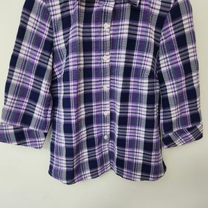 Elevate your wardrobe with this stylish plaid button-up shirt from Rebecca Malone. This top features a striking purple color with a timeless plaid pattern that makes it a versatile addition to any outfit. The shirt is designed with a collared neckline and 3/4 sleeves, giving it a casual and comfortable feel.