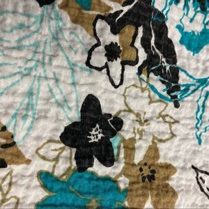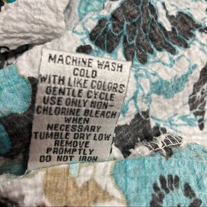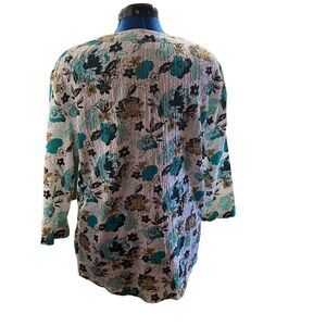 57% rayon, 42% polyester, 1% spandex, machine wash. REBECCA MALONE, Women’s Top, XL, Multicolored,button down, 3/4 length sleeves. Crepe material. Please see approximate measurements in pictures before purchasing. Use your own judgment as to the fit. Send me an offer. I will either accept or counter! W1,35A, cool, comfy, no ironing, casual