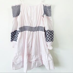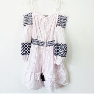 Rebecca Minkoff "Brittany" dress with embroidery. Off-the-shoulder neckline. Lace-up detail; tassel ties. Thin shoulder straps. Long sleeves. Fit-and-flare silhouette. Tiered, flounce hem. Mini length. Slipover style.