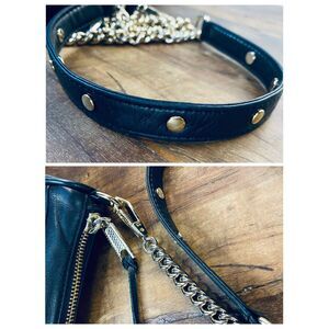Convertible Crossbody Black Leather and Chain Purse. This is the larger size, (not mini) which measures at 13"W x 8.5"H x 2"D. Roomy and stunning! Has a padded pocket on the inside with leather tab velcro closure that can fit a 9.5"w x 7"h tablet or iPad