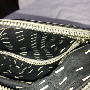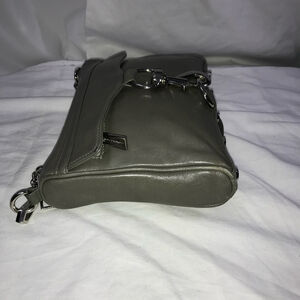 Elevate your style with the REBECCA MINKOFF Gray Leather Chain Strap Crossbody. The  removable chain strap and oversized metal feet add a touch of edgy elegance. An exterior zipper pocket is behind the large hook lock. The main section jas a zip closure with the interior having a one zip and theee open pockets.