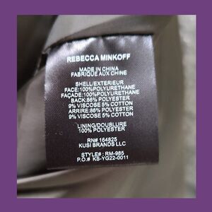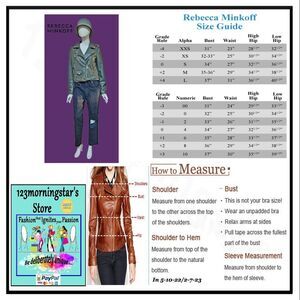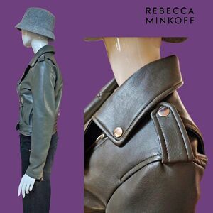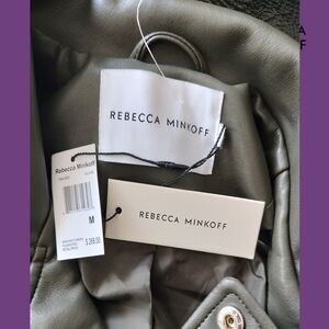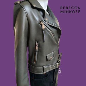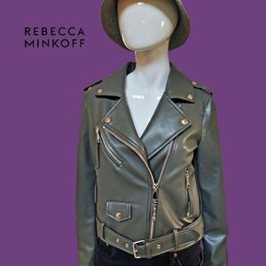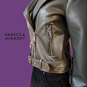 REBECCA MINKOFF |NEW| OLIVE Faux Leather Belted Hemline Moto Jacket M. Made from supple olive faux leather, moto jacket is slim fitting throughout and is detailed with notch lapels, polished metal hardware, and multiple zip pockets. Throw it over your favorite flowy dress for effortless vibes. See pics for details and the measurements provided below/the Table Chart in the pics to size this jacket.