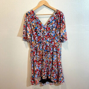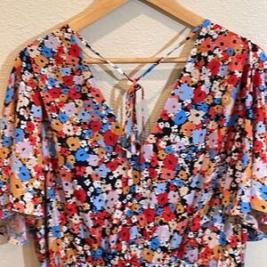 Abstract floral dress with flutter sleeves and a blouson silhouette embraces a summer vibe.