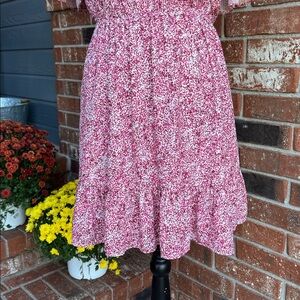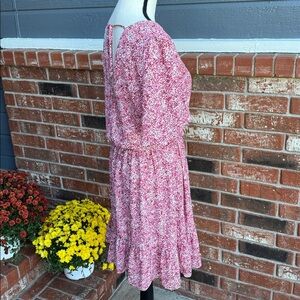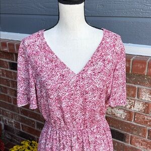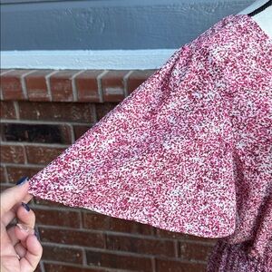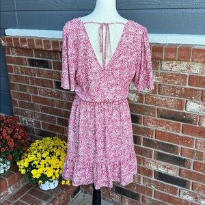 Ditsty printed dress with flutter sleeves and a blouson silhouette embraces a summery vibe. V-neck. Short flutter sleeves. Pullover style. Back self tie. Elasticized waist. Pleated. Ruffle hem. V-back. Lined.