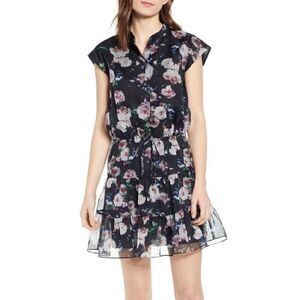 Rebecca Minkoff Ollie Black Floral Mini Dress. Size Small. A floral rose print blossoms on the gauzy overlay of a cap-sleeve dress complete with a tiered skirt.