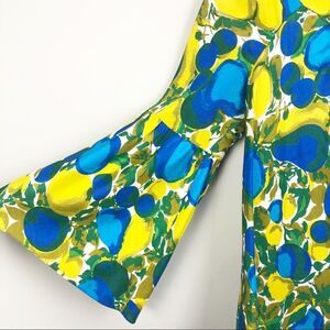 Gorgeous silk blouse by Rebecca Taylor! Bell style 3/4 length sleeves. Scoop neckline. Beautiful vibrant yellows and blues. Fruit look - pears, lemons, berries etc. or abstract dot print. Great condition - it used to be cinched in the back at the seam but preferred a roomier fit so it’s no longer gathered, just loose fit. Womens size 8.