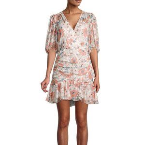 his stylish floral mini dress is accented ruching on the sides and a flounce hem.