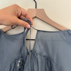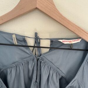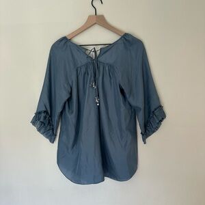 This stylish blouse from Rebecca Taylor features a charming tie front and ruffled cuffed sleeves, perfect for adding a touch of elegance to any outfit. The 3/4 sleeve length and versatile blue-gray color make it an ideal choice for both casual and business casual settings.