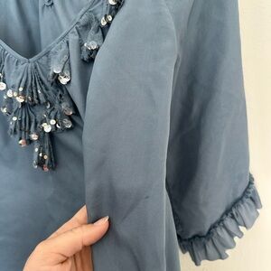 REBECCA TAYLOR Blue Gray Cuffed Sleeve Ruffled Sequence Blouse