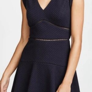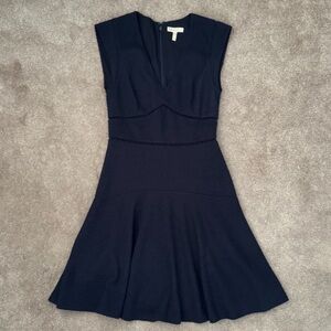 Subtle sheer seams give this Rebecca Taylor dress an up-to-date feel. Perfect paired with simple pumps or strappy heels. Navy knit (94% Polyester, 6% Spandex). Full skirt. Cap sleeves. V-neckline. Hidden back zipper with hook-and eye-closure. Fully lined. 35” from shoulder to hemline.
