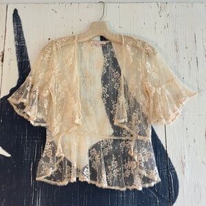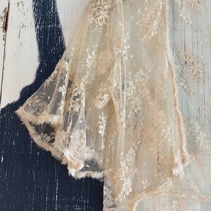 This is such a beautiful romantic inspired shrug with ruffled sleeves, and a peplum waist hem. Super feminine delicate with an antique Victorian feel with three-quarter length sleeves I just hit above the elbow.. This piece can be styled in many ways it’s a very versatile piece. It can be worn a strappy or strapless dress to cover arms., it can be worn over T-shirt or Tank with a pair of cut offs to add a little bit of feminine flare with western boots and you’re ready for a festival or Concert.