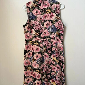 Excellent pre-owned condition. Gorgeous floral, sleeveless sheath dress with high mini ruffle collar. Back zipper closure.