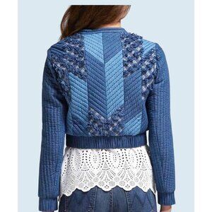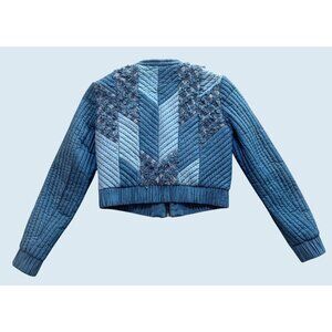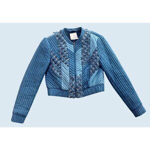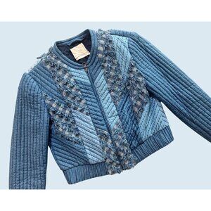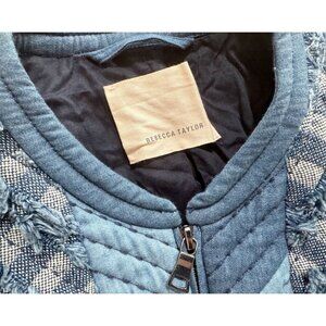 Gorgeous jacket by Rebecca Taylor.  Quilted and cropped.  Full zipper.  Various shades of blue.  Fraying / textured details.  Banded waist.  Zipper pockets.  Lined.  100% cotton.  No size tag.  Listed as a size XS based on measurements (see size diagram in photo section).  Pre-owned and gently worn in really great condition!