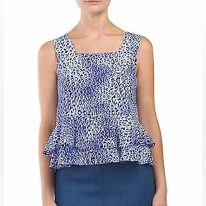 REBECCA TAYLOR Silk Leo Fever Blue Crush Leopard Peplum Ruffle Blouse Size 6 S
