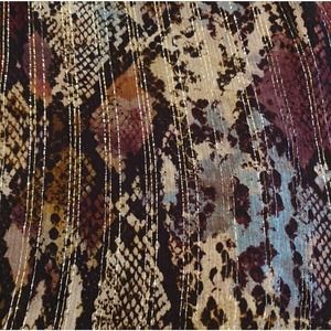 Thin strips of metallic lurex threading highlight the warm hues of the watercolor snake print on this sleeveless top. Front keyhole with button-and-loop closure. A button-optional v-neckline adds allure to this everyday style.