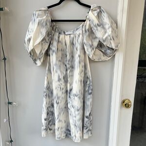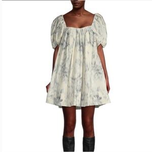 This gathered babydoll dress presents a soft blurred floral print, showcasing tulip-style sleeves.