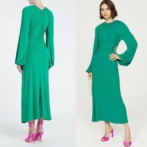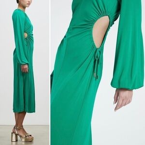 REBECCA VALLANCE 70s Ruched Tie Waist Cutout Long Bell Sleeve Disco Midi Dress 8