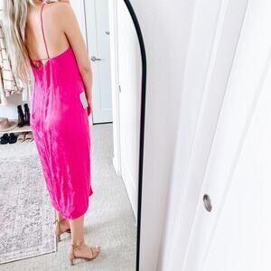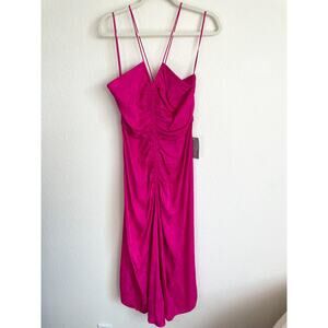Rebecca Vallance Bright Pink Satin Ruched Midi Dress