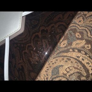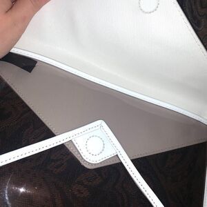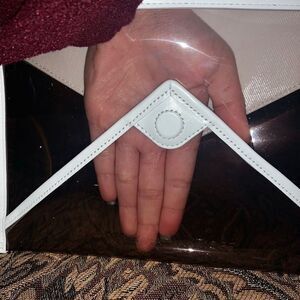This bag is beautiful!! Brand new with tags. It is a smoky clear (gray tint but still totally see through) with white leather bordering. It is a magnet close envelope shaped clutch. There is no handle or strap attached!