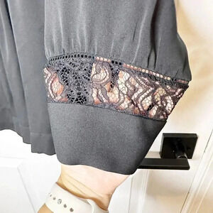 Long sleeve silk and lace sexy blouse with peek-a-boo lace panels along cuffs and front.
