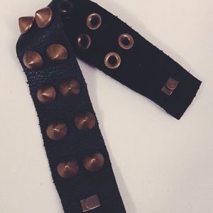 This genuine calf leather bracelet/wristband, studded with two rows of brasstone cone studs, is made by hand from upcycled biker chaps. Each one is unique. Limited run. 7.5” long open; 6.5” circumference when worn.
